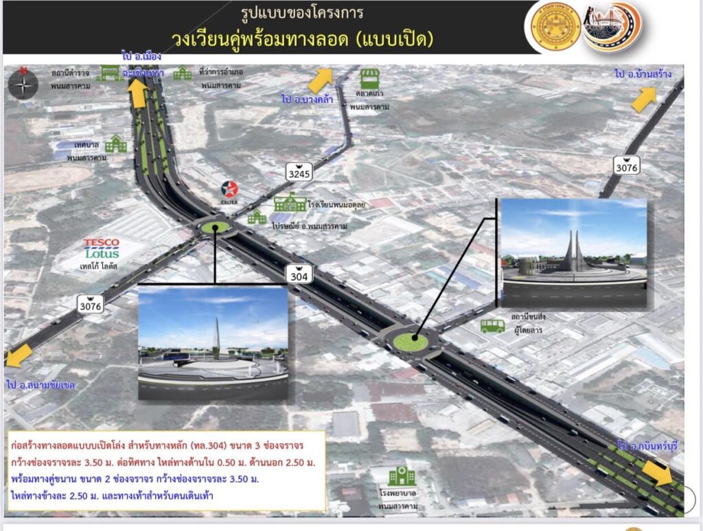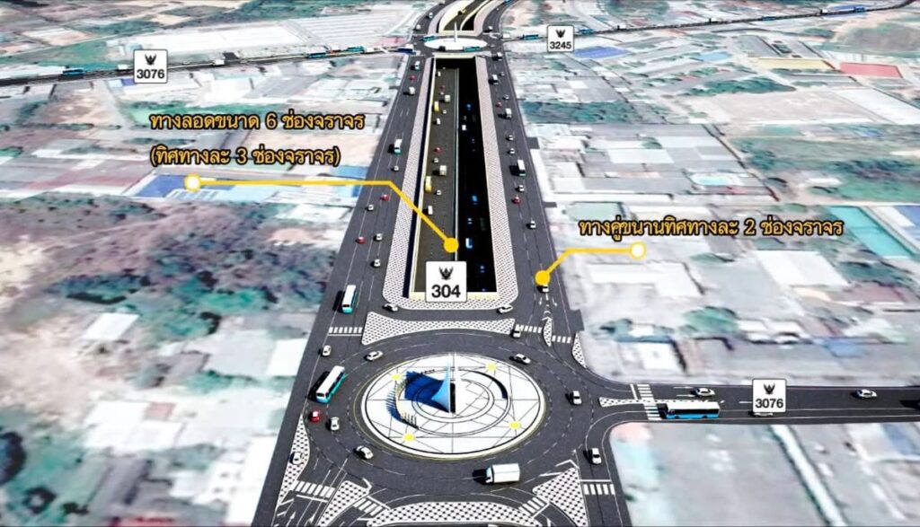 “ทีมข่าวนวัตกรรมขนส่งเดลินิวส์” รายงานด้วยว่า โครงการก่อสร้างบริเวณจุดตัดทล. 304 กับทล. 3245 (แยกพนมสารคาม) และจุดตัดทล. 3076 (3แยกไปอ.บ้านสร้าง) มีชุมชนหนาแน่น เป็นที่ตั้งของศูนย์ราชการ อาทิ รพ. พนมสารคาม ขณะนี้ใช้ระบบสัญญาณไฟจราจร มีปัญหาปริมาณรถหนาแน่นและเกิดอุบัติเหตุบ่อยครั้ง เส้นทางหลักตามแนวทล.304 (ขนาด 10 ช่องจราจร ทางหลัก 6 ช่อง และทางขนาน 4 ช่อง) มีปริมาณการจราจร 70% ที่เหลือใช้ทางหลวงสายรอง และการจราจรในพื้นที่ ได้ออกแบบก่อสร้างทางแยกต่างระดับเพื่อแยกรถทางหลัก โดยก่อสร้างทางลอดแบบคอนกรีตเสริมเหล็ก ขนาด 6 ช่องจราจร (3 ช่องจราจรต่อทิศทาง) กว้าง 31.40 เมตร ยาว 924.505 เมตร ตามแนวทล.304 จากบริเวณหน้าชุมสายโทรศัพท์ ไปสิ้นสุดหน้านนทรีปาร์ค พร้อมงานระบบอื่นๆ อาทิ งานระบบระบายน้ำพร้อมบ่อพักเพื่อป้องกันน้ำท่วม งานติดตั้งไฟฟ้าแสงสว่าง งานป้ายจราจรและอุปกรณ์อำนวยความปลอดภัย